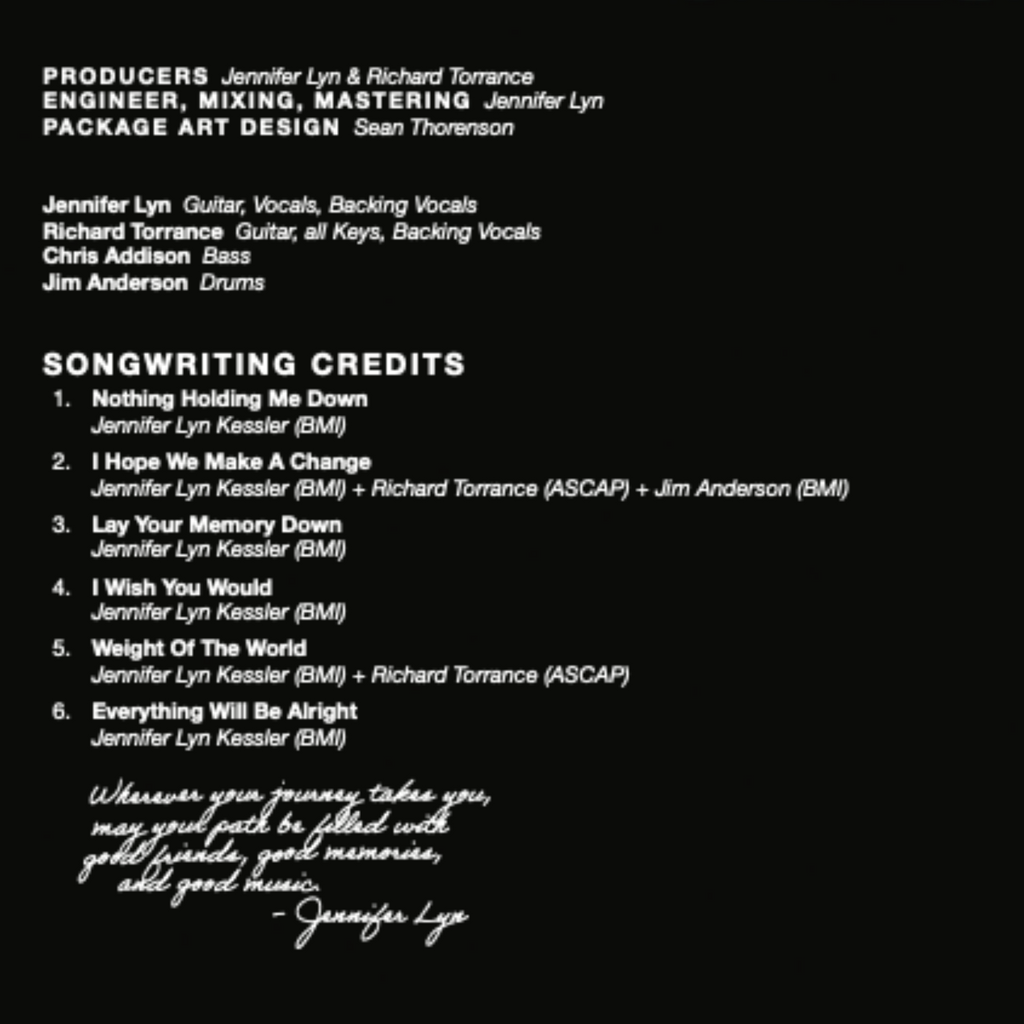 Nothing Holding Me Down, nominated for the Independent Blues Music Awards "Best Blues Rock Album," showcases the fiery soul of a woman immersed in the baptismal waters of Rock 'n' Roll. Jennifer Lyn, shaped by the music she absorbed from her parents' vinyl collection during her childhood, draws inspiration from various genres on this release, including Rock, Blues, R&B, and a touch of roots music. The album beautifully blends the nostalgic vibes of 60s and 70s music with a contemporary Blues-Rock twist.